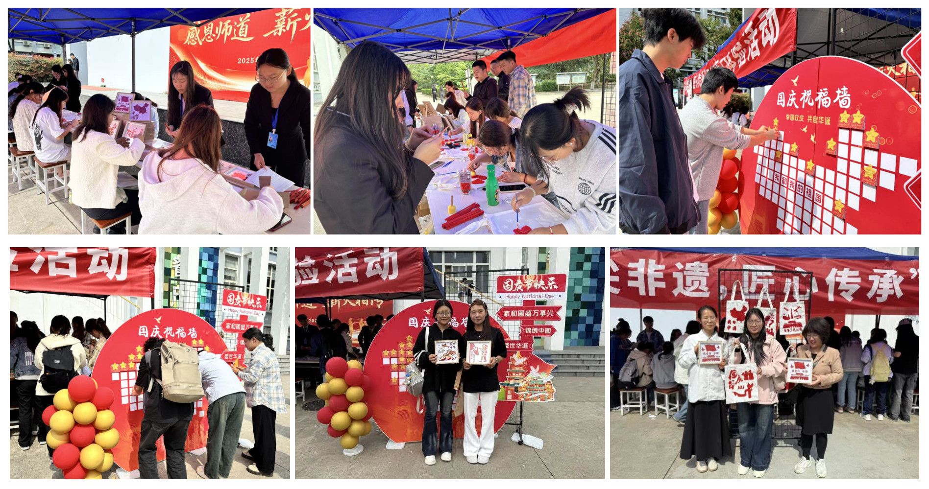 活动现场划分三大区域,广大师生积极参与,处处洋溢着创作热情。在非遗编织画区,同学们围坐在一起,自主探索编织技巧,不时互相交流心得,将对祖国的祝福藏进条纹里。每一幅逐渐成型的编织画,都成为承载爱国情感的独特载体。帆布包拓印区里,大家手持白色帆布包,用多种爱国图形的卡片拓印出各种图案,他们亲手制作的每个帆布包都成为了专属“国庆限定款”。而在“国庆祝福墙”前,师生们在贺卡上写下“祝祖国繁荣昌盛,国泰民安”、“愿以吾辈之青春,护我盛世之中华”等真挚话语,一张张祝福贺卡贴在祖国地图造型的祝福墙板上,很快组成一片满载心意的祝福海洋。