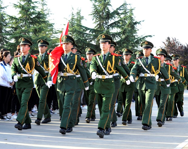 英姿飒爽的国旗护卫队员护送鲜艳的五星红旗进场